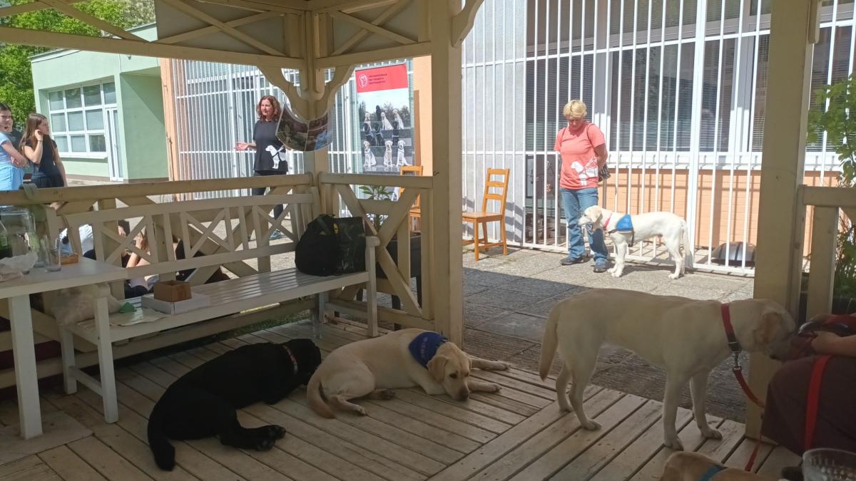Psi Anetka a Astin zase ukázali, ako trénujú budúci vodiaci psi – spoľahlivo viedli nevidiaceho po chodníku, obišli nebezpečné prekážky, priviedli nevidiaceho k dverám a doviedli ho k voľnému miestu na sedenie.